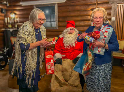 När alla fått sitt kaffe med jultårta och pepparkaka anlände Julgubben med säcken full av paket. Tyvärr hade Tor-Erik Lindholm litet tidigare blivit kallad bort på nåt viktigt uppdrag så han gick miste om att se Julgubben, men vi andra fick våra paket med små trevliga överraskningar.